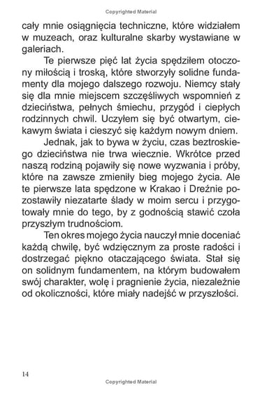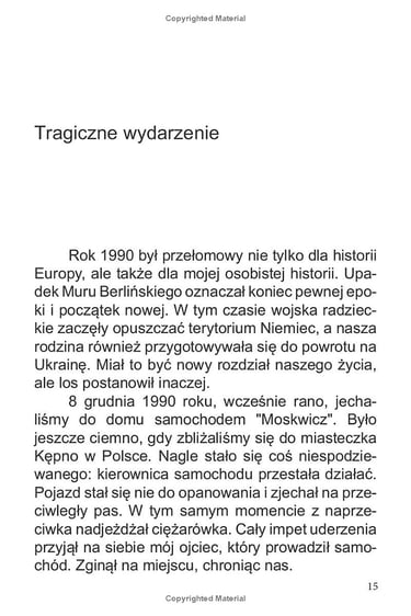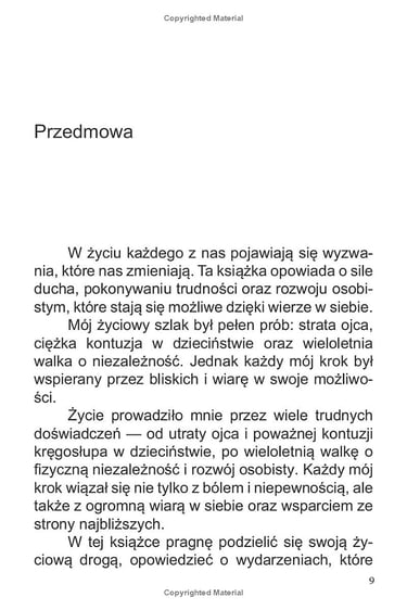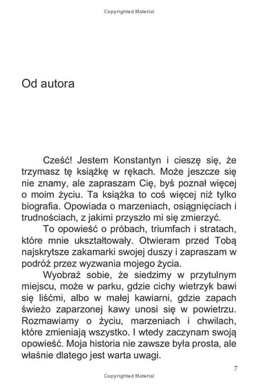 «Życie Kostiantyna Kuusk: Droga wytrwałości i triumfu» to inspirująca autobiografia, która opowiada o niezwykłym życiu Kostiantyna Kuusk. Urodzony w Krzemieńczuku na Ukrainie, Kostiantyn zmierzył się z wieloma poważnymi wyzwaniami, od tragicznej śmierci ojca po poważny uraz kręgosłupa, który doprowadził do paraliżu. Jednak mimo tych trudności, znalazł w sobie siłę, by nie tylko przetrwać, ale i odnieść sukces, przekształcając swoje przeciwności w źródło motywacji i wytrwałości.