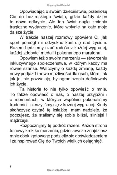 Książka prowadzi czytelników przez życie Kostiantyna, począwszy od jego wczesnych lat spędzonych w Niemczech, gdzie zetknął się z różnorodnością kultur i doświadczeń, aż po jego nieustanną walkę o fizyczną niezależność po wypadku, który zmienił jego życie. Pomimo wszystkich trudności, Kostiantyn odnalazł w sporcie nie tylko pociechę, ale także sens życia, poświęcając się pływaniu i maratonom, aby odzyskać kontrolę nad własnym losem i przekraczać granice możliwości.