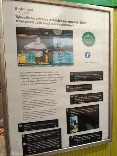 Na ścianach do dziś wiszą zdjęcia z 1995 roku, pożółkłe od czasu: uśmiechnięte twarze młodej ekipy, stare logotypy Coca-Coli. To był smak wolności: gorący, prosty, dostępny dla każdego. W artykule Wyborczej z 28 stycznia 2021 roku „Teatralka” nazwana została miejscem, które wychowało dwa pokolenia studentów. Jej popularność była tak wielka, że kiosk trafił nawet do planszowej wersji gry Monopoly.