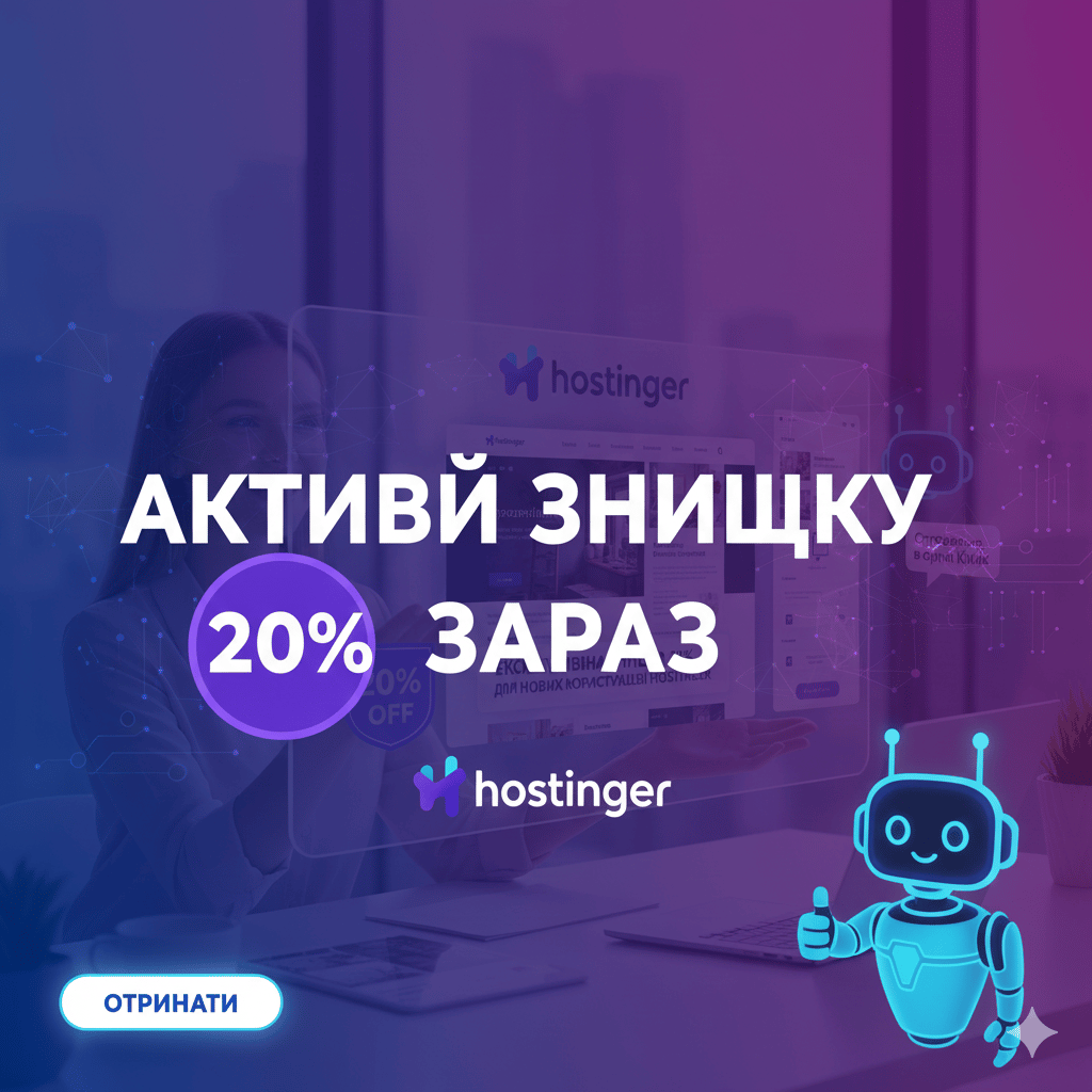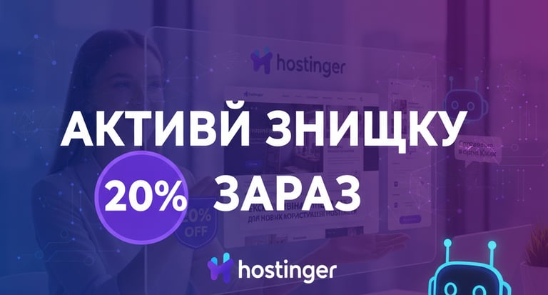 Отримайте ексклюзивну знижку 20% на Hostinger для нових користувачів. Це ваш ідеальний старт! Потужний хостинг та інноваційний Конструктор сайтів — комплексне рішення для вигідного підкорення онлайну. Не пропустіть!